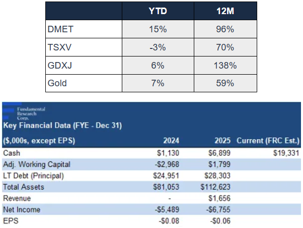 - Strong Project Economics: Shares are up 84% since our previous report in November 2025. DMET has completed an independent economic assessment (PEA) on its Zancudo gold-silver mine in Colombia. Based on an 11-year mine life, the study returned an after-tax NPV5% of $324M, assuming gold and silver prices of $4,000/oz (spot: $4,705/oz), and $50/oz (spot: $72/oz), respectively. DMET is trading at just 43% of NPV, suggesting the market is undervaluing the project, and entirely discounting the company’s other assets. We believe the study was conservative, covering only 60% of total resources.