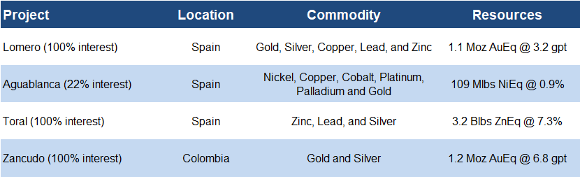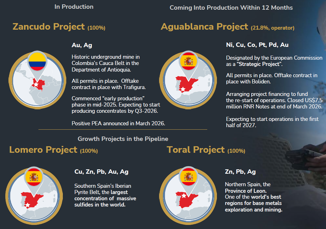 Portfolio of four polymetallic projects, led by Zancudo in early production, with full commercial production expected by Q3-2026, and Aguablanca positioned to begin production in 2027