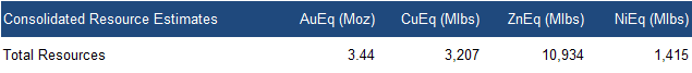 Combined resources of 3.44 Moz AuEq (gold equivalent) or 3.21 Blbs CuEq (copper equivalent) across four projects