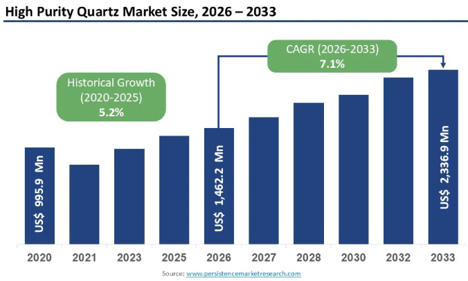 It is estimated that the global HPQ market will grow 7% p.a., from US$1.4B in 2026, to US$2.3B by 2033, driven by semiconductor and solar energy demand